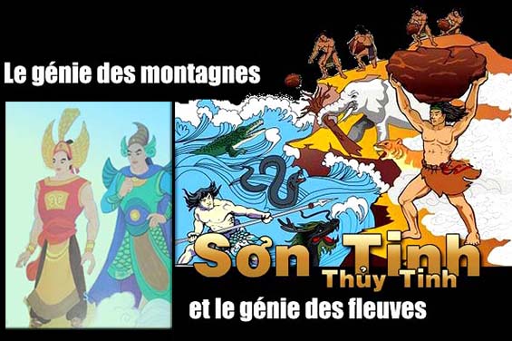 Le dix-huitième roi Hùng Vương avait une fille Mị Nương, d’une extraordinaire beauté. Quand elle arriva à l’âge de se marier, sa réputation éclata encore davantage partout. Le roi décida de lui choisir un mari talentueux. Un jour, deux jeunes hommes, brillants d’intelligence et de beauté arrivèrent fortuitement en même temps et demandèrent la main de Mị Nương. L’un s’appelait Sơn Tinh, génie des Hautes Montagnes et des Forêts Profondes, l’autre, Thủy Tinh , génie des Fleuves et des Mers Immenses. Le roi, embarrassé, ne sut pas choisir lequel car tous les deux avaient des talents incomparables et une puissance infinie. Après un moment de réflexion, le roi les mit devant un défi: cent plateaux de riz gluant, un éléphant à neuf défenses, un coq à neuf ergots, un cheval à neuf crinières rouges. Celui qui apporta le tout en premier sera l’époux de Mị Nương.
