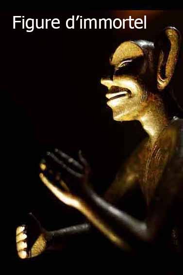 Analogue à leur prédécesseur Qin Shi Huang Di, les empereurs de la dynastie des Han envoyèrent, durant leur règne, des émissaires à la recherche des endroits paradisiaques dans le but de chercher l’immortalité et d’accéder au monde divin. Ces terres mythiques sont associées souvent à l’île Penglai (đảo Bồng Lai) située à l’est et au mont Kunlun (Côn Lôn) à l’ouest dans les croyances de l’époque des Han. C’est la montagne où demeure la Reine Mère de l’Ouest (Tây Vương Mẫu)(Xiwangmu) ayant détenu l’élixir d’immortalité. C’est pour cette raison qu’on trouve sa présence récurrente dans le décor des tombes des Han. Cela témoigne non seulement de sa popularité mais aussi de la conception taoïste liée à la prolongation de la vie au-delà la mort. Selon certaines rumeurs non vérifiées et injustifiées, Zhang Quian fut chargé au départ par Wudi pour rechercher les recettes d’immortalité du côté du mont Kunlun, la demeure occidentale des immortels. Vêtus toujours d’une tunique longue, ceux-ci ont un visage allongé et anguleux, une large bouche au dessus d’un menton pointu, des sourcils arqués et de larges oreilles, ce qui leur donne une silhouette assez étrange et un aspect émacié. Une fois le dao atteint, ils ont des ailes aux épaules. Dans la conception taoïste de l’au-delà, pour garder l’intégrité physique du défunt et l’immortalité de son âme, il faut obturer les 9 orifices de son corps par les pièces en or et en jade. (bouche, oreilles, yeux, narines, urètre, rectum).