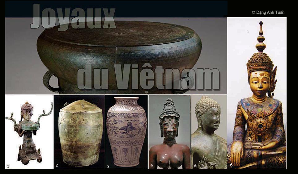 Etant la terre des civilisations, le Vietnam recèle au bout d’un siècle de fouilles archéologiques entamées d’abord par les archéologues français puis par ceux du Vietnam, un grand nombre de trouvailles dont certaines se distinguent par leur beauté incommensurable et par leur originalité exceptionnelle. Certains spécimens deviennent les joyaux de la nation et représentent l’une des trois civilisations découvertes au Vietnam. On peut les admirer dans les musées de l’histoire du Vietnam (Hanoï, Đà Nẵng, Saïgon, An Giang). Parmi ces objets exhumés, on peut citer le célèbre tambour de bronze Ngọc Lũ, symbole de la civilisation dongsonienne. Il est suivi ensuite par