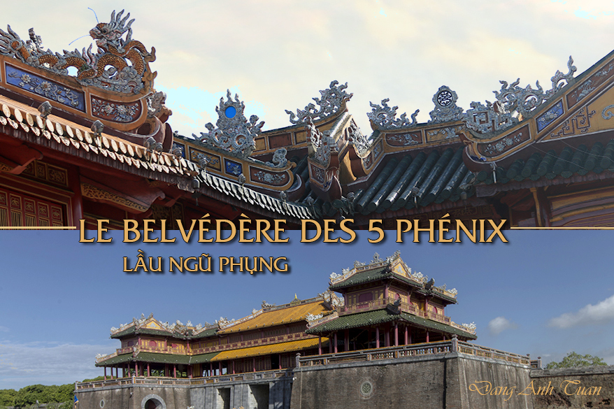 Le belvédère des Cinq phénix est l’une des œuvres architecturales les plus remarquables de la dynastie des Nguyễn dans la Cité interdite. Dans l’ensemble, on le voit comme un groupement de cinq rangées de dépendances à l’image de 5 phénix juchés intimement avec leurs ailes déployées. C’est une image que l’on aime associer à l’harmonie trouvée dans le Ying et le Yang et à l’âge d’or du puissant royaume Đại Nam dirigé par le roi Minh Mạng. Le phénix est un oiseau qui n’apparaît qu’en temps de paix et se cache en cas de troubles dans les légendes. Le belvédère des Cinq Phénix est en fait un complexe architectural construit en bois de fer et il est utilisé comme la tribune de la cour royale destinée à organiser des cérémonies annuelles telles que la cérémonie Truyền Lô (nomination des lettrés dans les concours royaux et provinciaux), la cérémonie Ban Sóc (publication du nouveau calendrier lunaire), cérémonie Duyệt Binh (défilé militaire) etc. Il est situé dans la partie supérieure du complexe architectural Ngọ Môn tandis que la partie inférieure de ce dernier est un puissant massif en maçonnerie environ de 6 mètres de haut, 27 m de large et 58 m de long et construite sur une surface en forme de U avec la partie concave tournée vers l’extérieur. Le matériau utilisé est en brique, en pierre « thanh » et en laiton. Selon l’observation du chercheur Phan Thuận An, ces deux parties sont bien engrenées dans une cohésion parfaite, de la totalité de l’ensemble jusqu’aux détails.