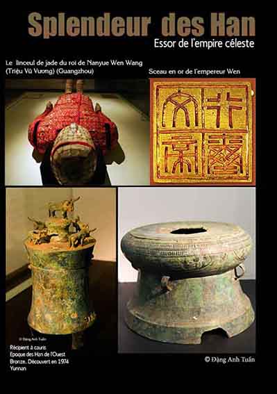 To expand his empire, he soon launched military expeditions not only to the North against the Xiongnu (Hung Nô) but also to the south in Fujian (Phúc Kiến), Guangdong (Quảng Đông), Guangxi (Quảng Tây), and Northern Vietnam (Giao Chỉ). It was in these southern regions that, after his death, one of his generals named Zhao To (or Triệu Đà), allied with the Yue, founded the kingdom of Nan Yue (or Nam Việt), which Vietnamese historians still consider their territory because it succeeded in annexing in the meantime the Âu Lạc kingdom of the Vietnamese. Eliminating several rival generals and emerging victorious from the final confrontation with the brilliant descendant of the general Xiang Yang (Hạng Yên) of Chu, Xiang Yu (Hạng Vũ), the former uneducated relay leader turned bandit chief Liu Bang (Lưu Bang), who came from the common class, proclaimed himself emperor in 202, established his capital at Chang’an (not far from present-day Xi’an), and thus founded the Han dynasty. He will go down in history under the name Gaozu (Hán Cao Tổ). His rise was due neither to birth nor family but rather to his talent in managing the abilities of his three companions, each having a decisive role in the conquest of power: governance with Xiao He (Tiêu Hà), strategy with Zhang Liang (Trương Lương), and military tactics with Han Xin (Hàn Tín).