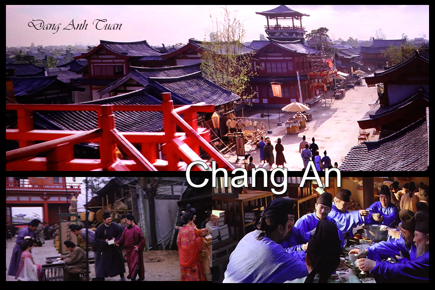 Under the Tang dynasty, Chang-An was the largest cosmopolitan city in the world at that time. It was nicknamed the « city of a million inhabitants » in Chinese records. Known as « Eternal Peace, » it was the most densely populated city in the world, ahead of Baghdad and Byzantium. But according to the census record in the year 742 in the New Book of Tang (Tân Đường Thư), Chang-An and its surroundings had 362,921 families totaling 1,960,188 people, while it is estimated that more than 50 million inhabitants lived in China at that time across a territory stretching from the East China Sea to Central Asia, from the Gobi Desert in the north to beyond the Nanglin (Lĩnh Nam) mountains in the south where Annam is located. Covering an inland area of almost 87 km², the cosmopolitan capital Chang-An was not only a center of political and economic power but also a haven of peace with wide avenues, magnificent palaces, Buddhist temples, private gardens, and vast markets. Its broad avenues and streets were arranged in a rectangular grid of 114 blocks of houses, each individually walled and all protected by the same outer wall.