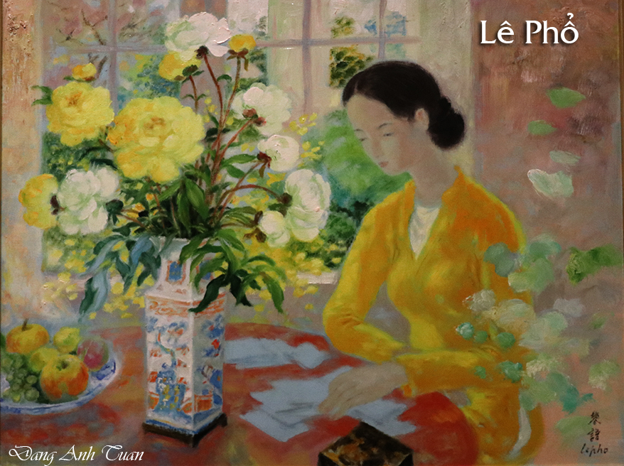 In the mid-1950s, the theme of the Divinity appeared, reminiscent of the figure of Buddha but which Vũ Cao Đàm wanted to be universal. Its image was fixed in 1960: the Divinity is frontal, with drooping shoulders giving it a feminine softness. Numerous color variations, both in the robe and in the background, were created over the years.
