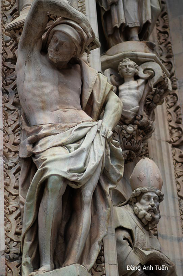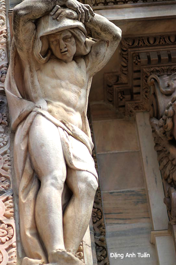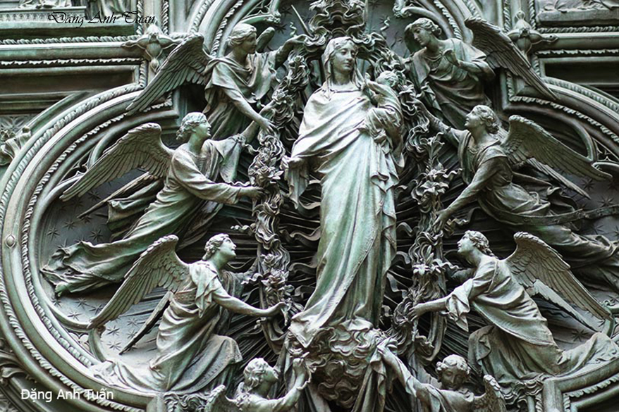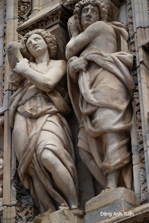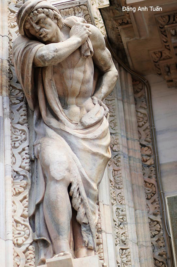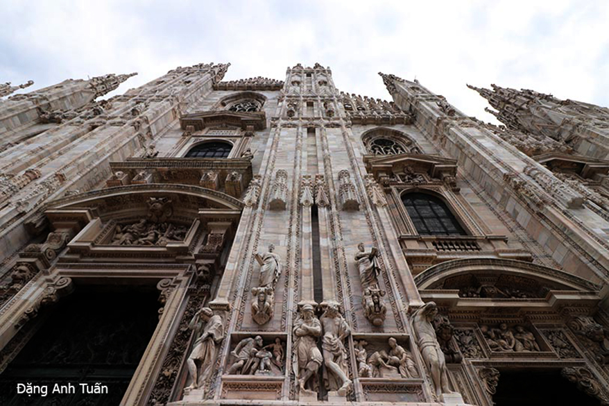 Còn thánh đường Milan, đây là một kiến trúc phong cách gô tích, và tân cổ điển với diện tích gần 12000 m2, dài 157 m, rộng 93m, có sức chứa đến 4000 người. Nó được xem là nhà thờ lớn nhất ở Ý Đại Lợi và được xếp hàng thứ 4 ở châu Âu chỉ sau nhà thờ St Pierre ở Vatican, Saint Paul ở London và nhà thờ Seville của Tây Ban Nha. Nhà thờ được xây bằng gạch đá cẩm thạch trắng , làm quyến rũ các du khách khi đến tham quan với 2000 bức tượng trong đó có bức tượng David chặt đầu Goliath và 136 mũi tên trang trí ở các mặt chính. Đây là một kiệt tác không thể bỏ qua khi đến Milan. Nhưng muốn xem bên trong nhà thờ thì mất ít nhất 2 tiếng rưởi. Rất tiếc thì giở không có nên mình không có thể xem được cây thánh giá của Léonard de Vinci. Được xây cất vào năm 1386 dưới sự thúc đẩy của lãnh chúa Gian Galeazzo Visconti nhưng được hoàn thành sau 500 năm khi hoàng đế Napoléon Bonaparte muốn được phong làm vua của Ý Đai Lợi ở thánh đường Milan. Khi nhắc đến thành phố Milan thì không thể nào không nói đến gia đình Visconti , một gia tộc qúi phái có quyền lực từ thờ i Trung Cổ đến thời kỳ Phục Sinh (Renaissance) từ 1277 đến 1447. ở vùng Lombardie. Có một đạo diễn nổi tiếng thuộc gia tộc nầy đó là ông Luchino Visconti được biết đến với bộ phim The Leopard (1963) và Death in Venice (1971).