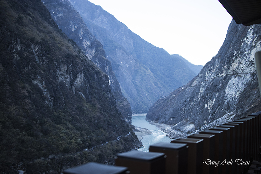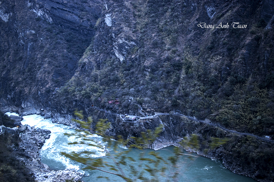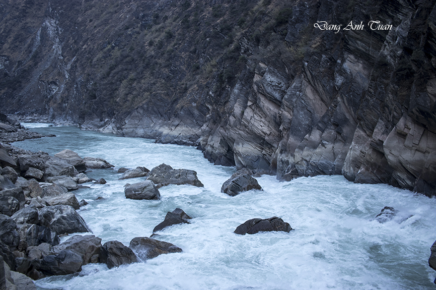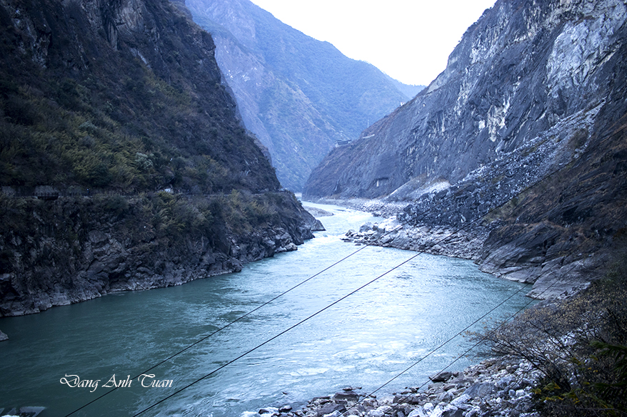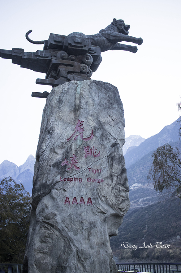 Being known in pinying 虎跳峡 (Hu tiào xiá) by the Chinese, Tiger Leaping Gorge was formed on the Jinsha River, a tributary of the Yangtze River. It is a famous scenic spot located 60 kilometers north of Lijiang City in Yunnan Province and 100 kilometers from Zhong Dao, now Shangrila. It is about 16 kilometers long, situated between two mountains: Jade Dragon Snow Mountain (Yulong Xue Shan) at 5596 meters and Haba Snow Mountain (Haba Xue Shan) at 5396 meters, featuring a serie of 18 rapids surrounded by steep cliffs and a deep abyss of 2000 meters, considered the deepest river gorge in the world.