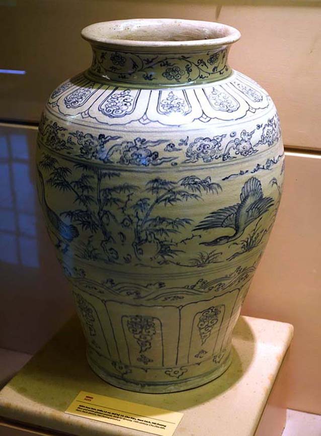 3°) The ceramic vase (gốm) with an attractive decoration of landscape painted in color « blue and white » . It was retrieved from the wreck of Cù Lao Chàm island (Quảng Nam). Thanks to the swan motif, one discovers the traits of Vietnamese soul. History museum of Hanoï.