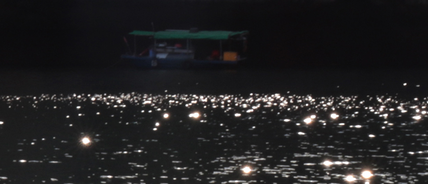 Un banc de poissons saute hors de l’eau de la baie de Lan Ha pour créer les points lumineux d’un blanc argenté visibles à distance. Ce phénomène est dû à un manque d’oxygène à cause de la chaleur, ce qui incite les poissons à sauter hors de la surface de l’eau afin de pouvoir respirer.