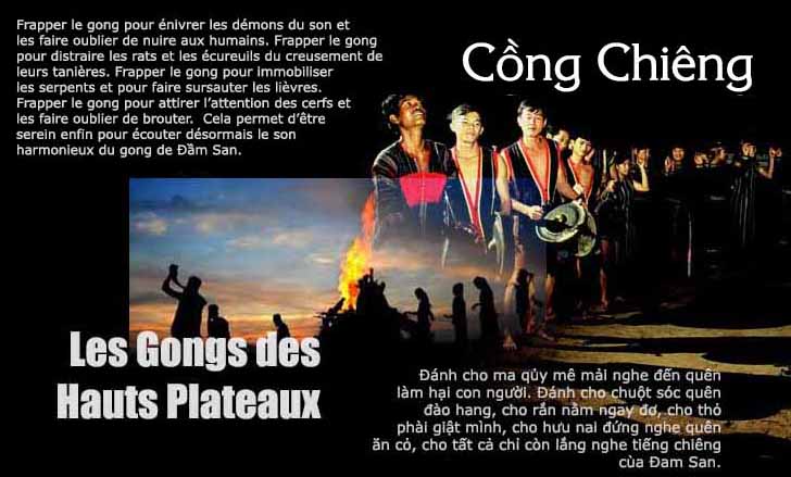 Pour le transformer en un gong des Hauts Plateaux, il faut l’éduquer par les coups de maillet en bois pour qu’il connaisse ainsi la langue Bahnar, Stieng, Edê, Mnong etc… Il a désormais l’âme sacrée (hồn thiêng) des Hauts Plateaux. Celle-ci ne disparaît pas tant qu’il y a encore l’environnement où le gong est « éduqué » (la forêt, les ethnies, les villages, les sources d’eau, les animaux etc…). Le caractère sacré du gong ne peut qu’être trouvé dans ce milieu naturel qui lui permet de retrouver son identité ethnique à travers les mélodies variant d’un village à un autre ou d’une ethnie à une autre et les rites agraires. Le gong peut produire une fausse note au fil des années d’utilisation. On dit qu’il est « malade ». Il faut le soigner en faisant venir un médecin (ou un bon accordeur) qu’il est difficile de trouver parfois sur place. Il faut se déplacer à plusieurs kilomètres dans d’autres régions pour arriver à le trouver. Une fois réajusté le son, on dit que le gong est guéri. Lire la suite (Tiếp theo)