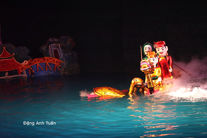 Các con rồng vật lộn phun lửa, các con rùa nổi lên thình lình trước các khán giả. Cuối buổi trình diển thường có sự xuất hiện của các nghệ nhân, tính kiên cường dầm mình trong nước suốt buổi trình diễn. Có nguồn gốc từ đồng Bắc bộ, múa rối nước là một hình thức biểu hiện cá biệt có lâu đời ở Việtnam. Nó còn là một di sản văn hóa phi vật thể của nhân loại. Tâm hồn của người dân Việt được tìm thấy qua trò rối nước nầy. Đây là một nghệ thuật sân khấu mà người du khách không thể thiếu khi có dịp đến tham quan Hà Thành hay Saïgon.