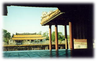 Vu dans l’ensemble, celui-ci ressemble à un groupement de 5 phénix juchés intimement avec leurs ailes déployées. Ce belvédère possède cent colonnes en bois de fer et peintes en rouge permettant de supporter ses neuf toitures. Ce chiffre 100 a été bien examiné par les spécialistes vietnamiens. Pour l’archéologue renommé Phan Thuận An, il correspond exactement au nombre total obtenu par l’addition des deux nombres trouvés respectivement dans le plan du Fleuve (Hà Ðồ) et l’Ecrit de la rivière Luo (Lạc thư cửu tinh đồ) et symbolisant ainsi l’harmonie parfaite de l’union du Yin et du Yang. Ce n’est pas l’avis d’un autre spécialiste Liễu Thượng Văn. Selon ce dernier, cela représente la force de 100 familles ou du peuple (bách tính) et reflète bien la notion dân vi bản (prendre le peuple comme base) dans la gouvernance de la dynastie des Nguyễn. La toiture du pavillon central est couverte de tuiles jaunes « lưu ly », les autres de tuiles bleues « lưu ly ». La porte principale, juste au milieu, c’est la porte méridienne (Ngọ Môn) pavée de pierres « Thanh » teintées en jaune, et consacrée au passage du roi. Des deux côtés, on trouve la porte de Gauche et la porte de Droite (Tả, Hữu, Giáp Môn) réservées aux mandarins civils et militaires. Puis les deux autres portes latérales Tả Dịch Môn và Hữu Dịch Môn sont prévues pour les soldats et les chevaux. C’est pourquoi on est habitué à dire en vietnamien :