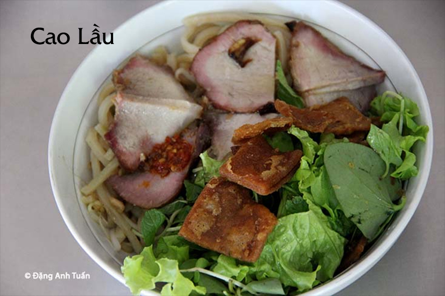 C’est une marque d’identité gastronomique de Hội An. Contrairement aux autres spaghetti, ce Cao Lầu est préparé à partir de la pâte de riz étalée en couche mince macérée dans l’eau de cendre (nước tro) du bois des arbres de l’îlot Poulo-Cham (Cù lao Chàm) et ayant passé trois feux avant, ce qui lui donne l’apparence de couleur jaune clair naturel. Selon l’écrivain Hữu Ngọc, si le plat Cao Lẩu ne réussit pas à vous faire une bonne impression, son histoire le fera à sa place car il fut venu à Hội An en même temps que les marchands japonais à la fin du XVIème siècle. Certains d’eux appréciaient la cuisine vietnamienne car ils avaient pour épouses des femmes vietnamiennes. D’autres préféraient garder leurs habitudes et importer la nourriture de leur pays, en particulier le plat de nouilles de riz semblable à celui de Cao Lầu d’aujourd’hui. Mais le spaghetti de Cao Lẩu de Hội An exige une préparation minutieuse et artisanale. Ce n’est plus le cas du Cao Lẩu japonais d’aujourd’hui avec sa pâte produite de façon industrielle. Outre le pont-pagode, l’influence de la contribution japonaise ne décline pas au fil des ans à travers ce plat incontournable.