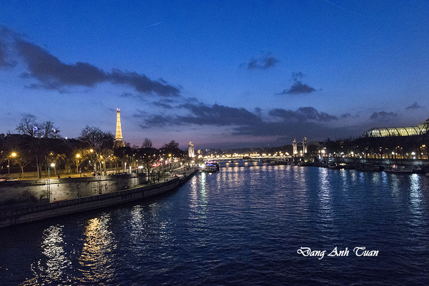 Các tia nắng ở cuối ngày cùng dòng nước óng ánh lên sắc cam rực rỡ của sông Seine  tạo ra một quan cảnh tuyệt vời khi thành phố bắt đầu lên đèn. Bạn sẽ ngẩn ngơ và cảm nhận thích thú rạo rực trong lòng ít nhiều  khi có được những khoảnh khắc kỳ diệu nầy. Đây cũng là những kỷ niệm khó quên khi bạn có dịp đến với kinh đô ánh sáng Ba Lê.