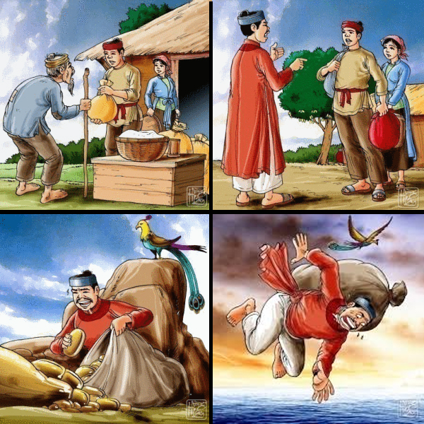 The elder couple proposed an exchange of their fortune for only the hut and the star fruit tree. The younger agreed. One day, the raven came back to eat the star fruits and gave the same recommendation: a three-foot bag to go looking for gold. The elder greedy and curious, brought with him two big six-foot bags and when on the spot, filled them with gold. On the way back, burdened by the overweight of of the two bags, the raven who could not hold any longer, swayed and sent the elder to the sea where he drowned. The elder was the object of much despise when people knew about his greed and stinginess. God always helps good people and always punishes naughty people.